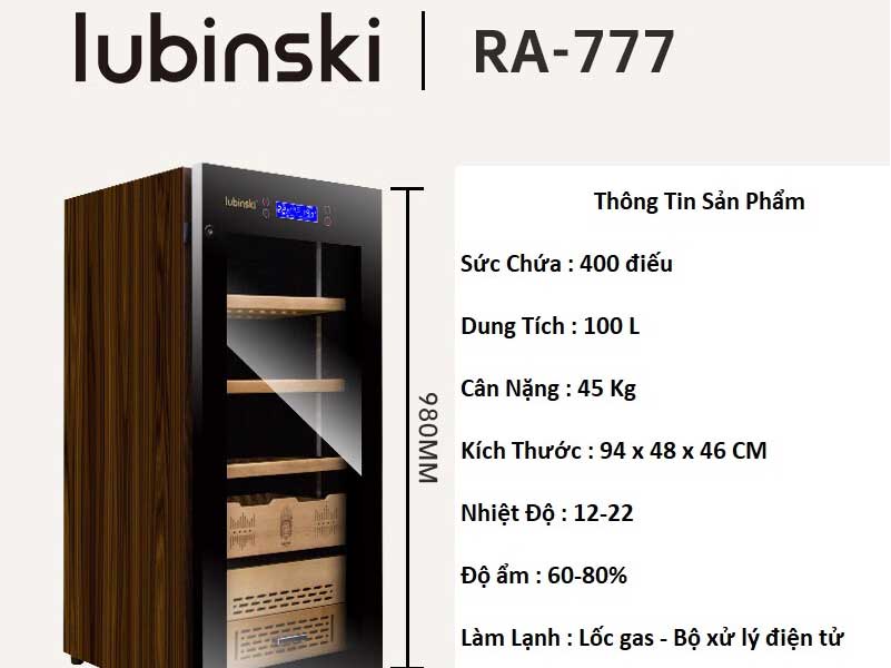 Tủ điện xì gà Lubinski RA 777 là dòng tủ bảo quản cao cấp thuộc phân khúc sang trọng, được thiết kế dành riêng cho những người sở hữu bộ sưu tập xì gà lớn hoặc muốn trưng bày xì gà theo phong cách chuyên nghiệp. Với sức chứa lên đến 500 điếu, mẫu tủ này đáp ứng hoàn hảo nhu cầu sử dụng tại gia, văn phòng, cigar lounge, showroom hoặc làm quà tặng đẳng cấp cho đối tác VIP.